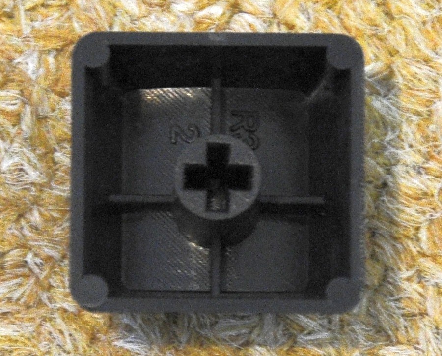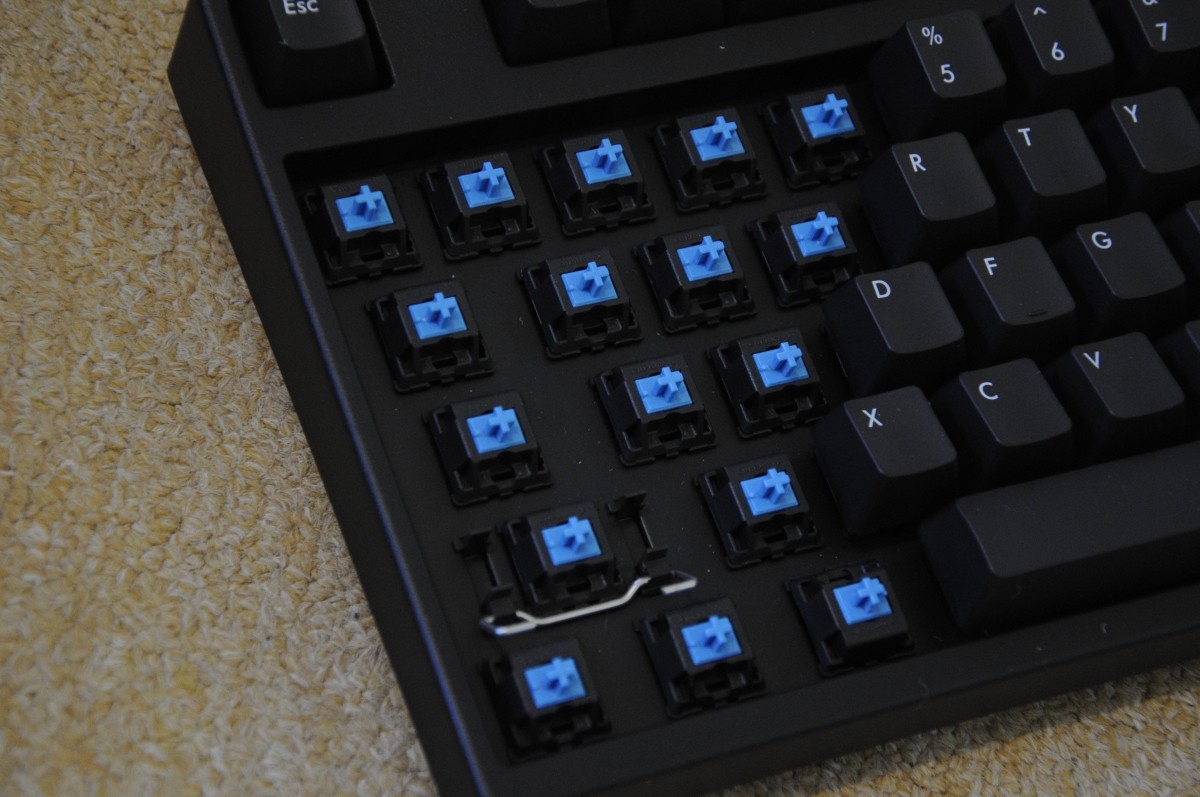 De Filco Majestouch 2 heeft duidelijk blauwe switches. Bij de shiftknop zit een metalen beugel, waar je even goed op moet letten als je de toets loshaalt. Als je te hard trekt, trek je de hele zaak kapot. De onderkant van de keycaps verraadt dat de blauwe plus precies in het gat past. Niet te wild mee doen, dit is alleen stevig als de keycap op de switch vast zit.