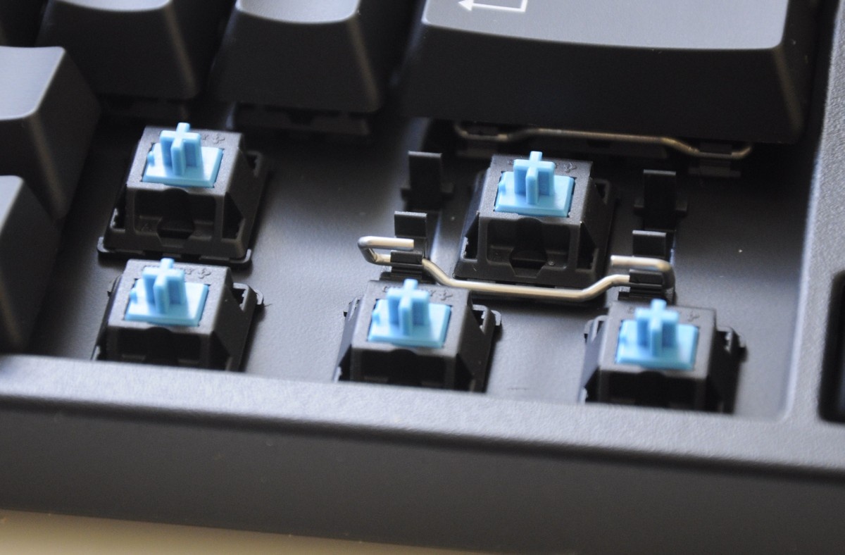 Bij de Shiftknop en de spatiebalk zitten zogenaamde "stabilizers". Deze metalen stangetjes zorgen ervoor dat je overal even makkelijk op de knop kunt drukken. Druk op je goedkope Logitech maar eens helemaal links op de spatiebalk: dat lukt je niet. Hier wel.