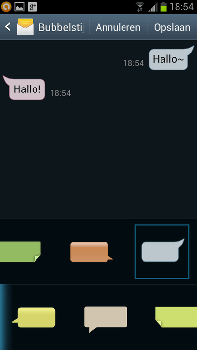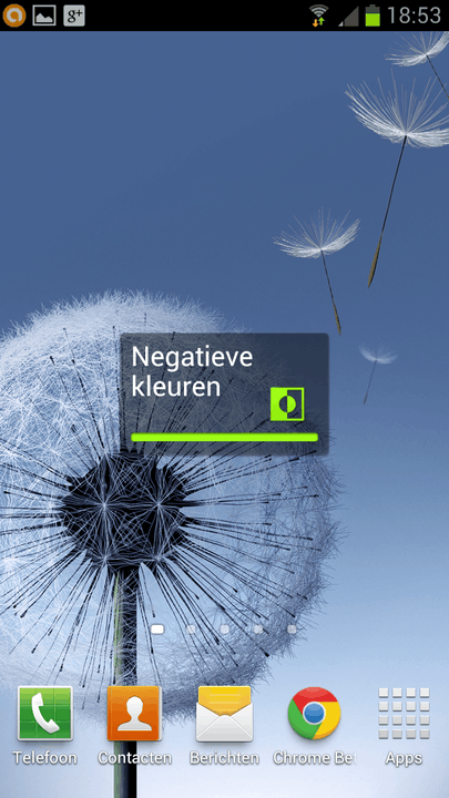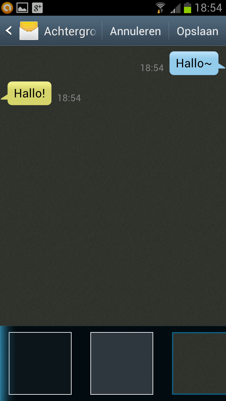 Als we bij 'berichten' op opties en dan instellingen klikken zien we een paar nieuwe aanpassingsmogelijkheden. Zo kunnen we het scherm vanaf nu personaliseren door een eigen berichtenbubbel en/of achtergrond te selecteren. Niet echt wereldschokkend, maar toch weer iets nieuws wat nauwelijks gedocumenteerd is. Net zoals de nieuwe widget 'Negatieve Kleuren'. Als je op deze widget klikt worden vanaf dat moment alle kleuren op het scherm van de S III negatief weergegeven. In sommige situaties kan dit behoorlijk handig zijn, denk bijvoorbeeld aan het lezen van een website in minder ideale omstandigheden, maar ook in direct zonlicht kan het een uitkomst zijn. Jammer genoeg kon ik van deze negatieve instelling geen screenshot maken.