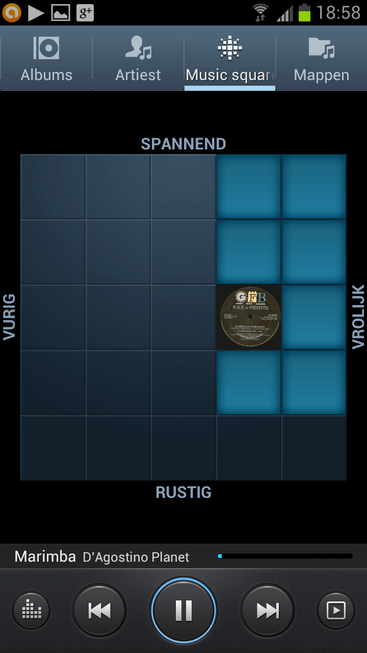 In de MP3-speler vinden we een andere uitbreiding: Music Square. Velen kennen deze functie al van andere applicaties, maar nu zit hij standaard in je MP3-speler ingebakken. Middels het drukken van een blokje kan men de MP3-speler muziek laten uitkiezen aan de hand van je stemming. Kies je een of meerdere blokjes in de buurt van 'vurig' zal er vurige muziek afgespeeld worden. De opties zijn vurig, spannend, vrolijk en rustig er je kan uit 25 vlakken kiezen. Zo is er voor elke stemming wel wat wils, mits je natuurlijk de geschikte mp3's hiervoor op je S III heb staan. Deze muziek wordt overigens gescanned op id3-tags om het voor deze functie te kunnen documenteren.