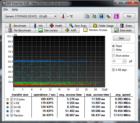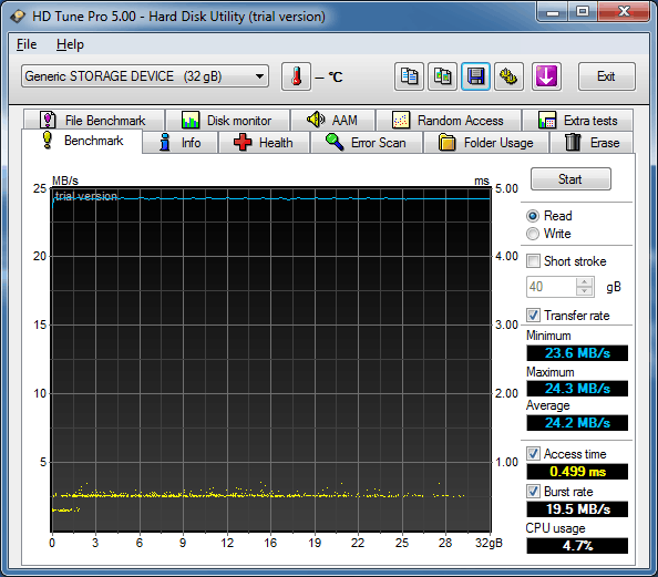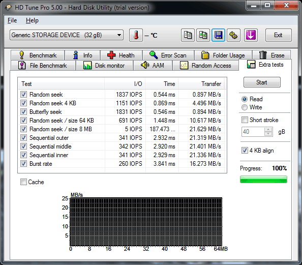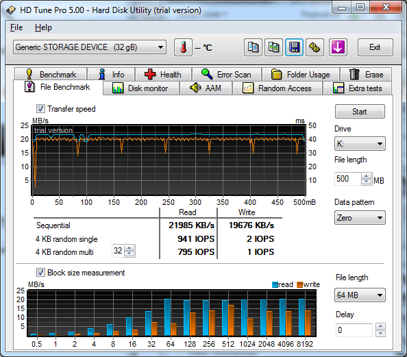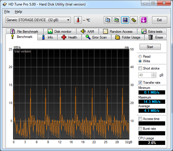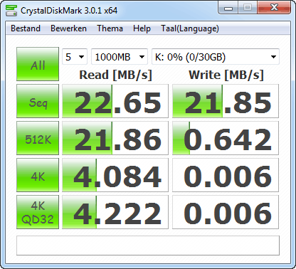 De leessnelheid is met een stabiele 24 MB/s wat mij betreft zeker best redelijk. Van de schrijfsnelheid ben ik echter minder te spreken. De gewone write benchmark binnen HD Tune geeft een merkwaardig resultaat. De file benchmark toont betere resultaten, waarbij de schrijfsnelheid gemiddeld boven de geadverteerde 10 MB/s ligt.