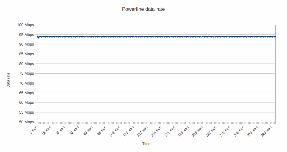 - De maximumsnelheid van de powerline adapters is ongeveer 94 Mbps, wat dicht bij de theoretische maximumsnelheid van de netwerkinterface ligt. Vermoedelijk is de netwerkinterface een beperkende factor en zou de snelheid, mits een gigabit netwerkinterface, hoger uitvallen.