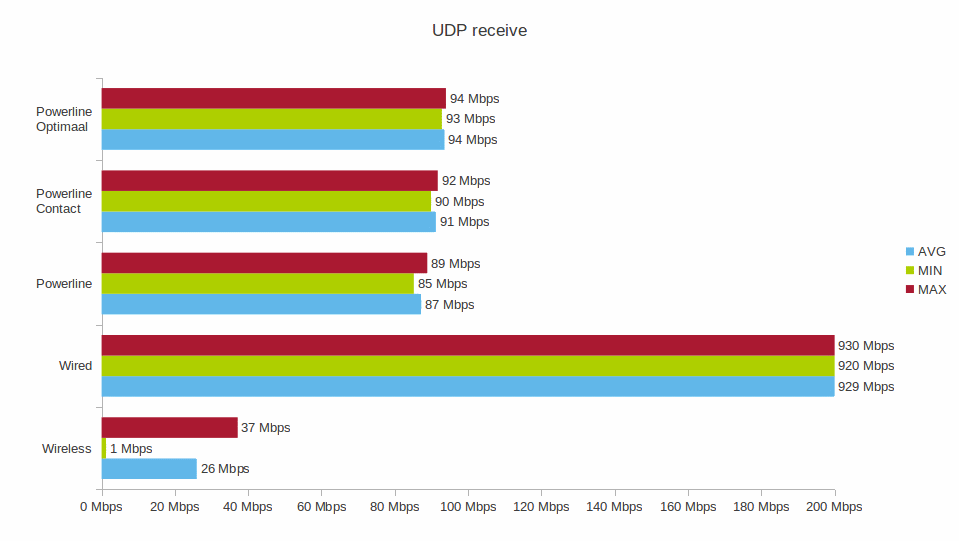 Zoals te verwachten is de bedrade verbinding significant sneller dan de powerline en de draadloze verbinding. We laten deze dan ook verder buiten beschouwing.
