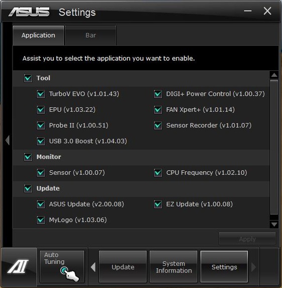 Een handige set tools die je de mogelijkheid bied om in een centrale applicatie je volledige systeem te beheren. Sommige tools zijn handiger dan de ander, maar tools zoals ASUS Update (BIOS update vanuit Windows), EZ Update (Updaten van de AiSuite tools) en TurboV EVO (1 click overclock) zijn zeer bruikbaar.