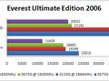 Om de meetbare prestaties te analyseren heb ik gebruik gemaakt van enkele tests van Everest Ultimate Edition 2006. Doordat ik vòòr de verkoop van mijn E6750 al wist dat deze Celeron processor hem tijdelijk zou opvolgen heb ik de tests ook gedraaid met de E6750 op E1200 snelheden. Dit geeft een goed idee van de prestatieverschillen veroorzaakt door verschillende cachegroottes. Om het geheel compleet te maken heb ik de E1200 ook op de stock snelheid van de E6750 laten lopen.
