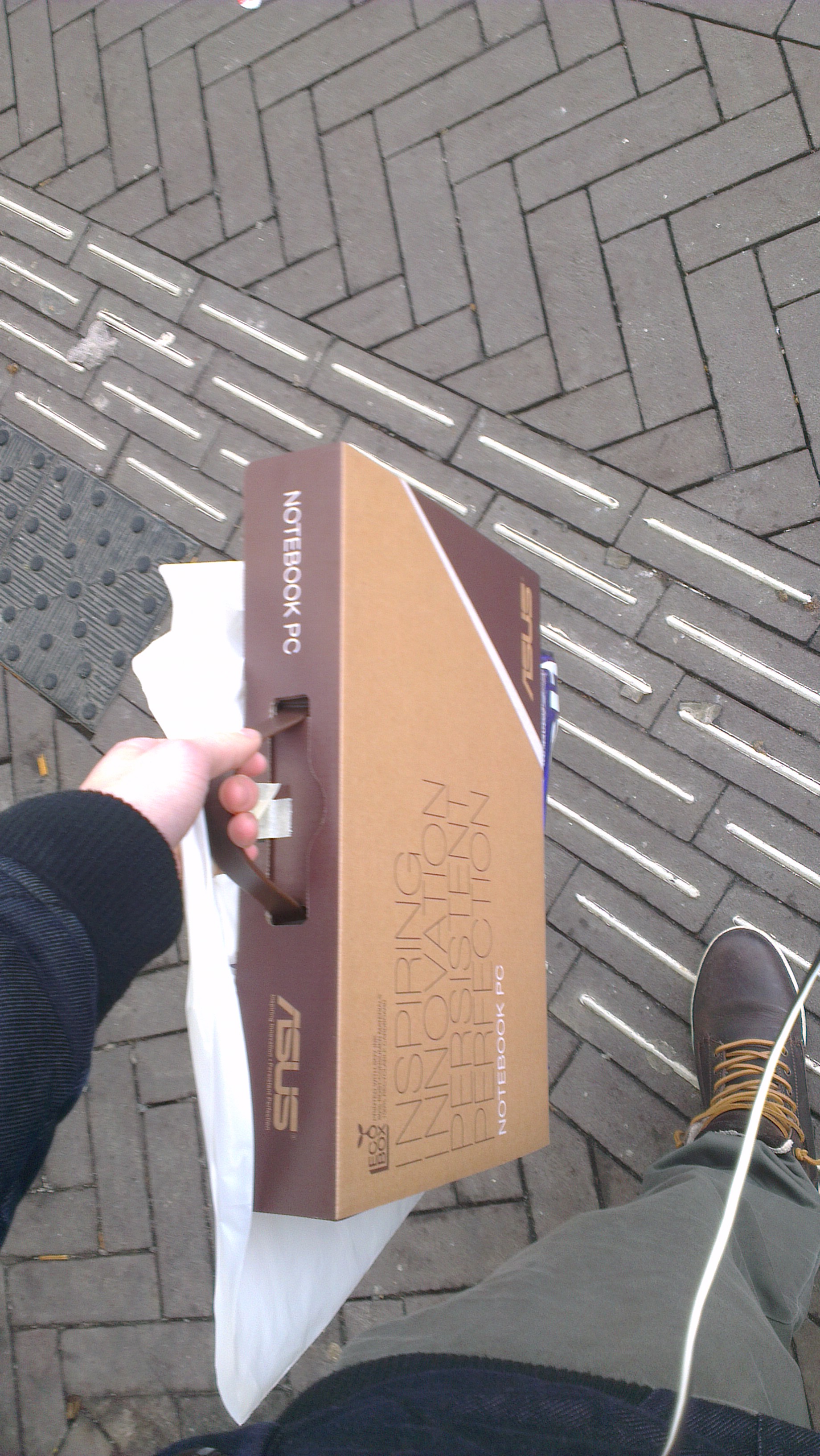Het kwam neer op een klein prijskaartje van 384,-. Ik was best verbaasd dat dit zomaar kon, ik direct mijn pa bellen of ik hem mee kon nemen! Ook ben ik over een week jarig dus dat kwam mooi uit, want ik wilde namelijk een laptop hebben voor mijn b-day! Normaal gesproken is de laptop tussen de 530 - 580 in de prijsvergelijking te zien van Hardware.info en Tweakers.net. Ik heb bij de laptop gelijk een muis en een notebook tas uitgezocht, want deze zou ik ook krijgen van mijn verjaardag.