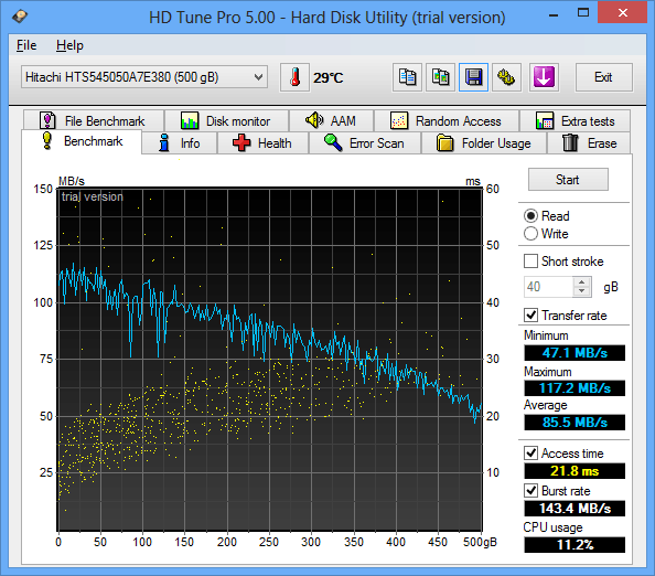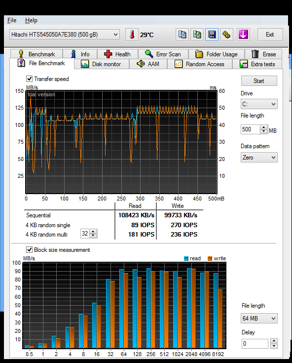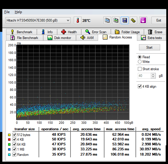 De hardeschijf is qua doorvoersnelheid snel genoeg. Helaas is de vertragingstijd (latency) 21ms met wat vreemde pieken naar boven van 60ms. Het systeem moet nogwel eens wachten op de HD.