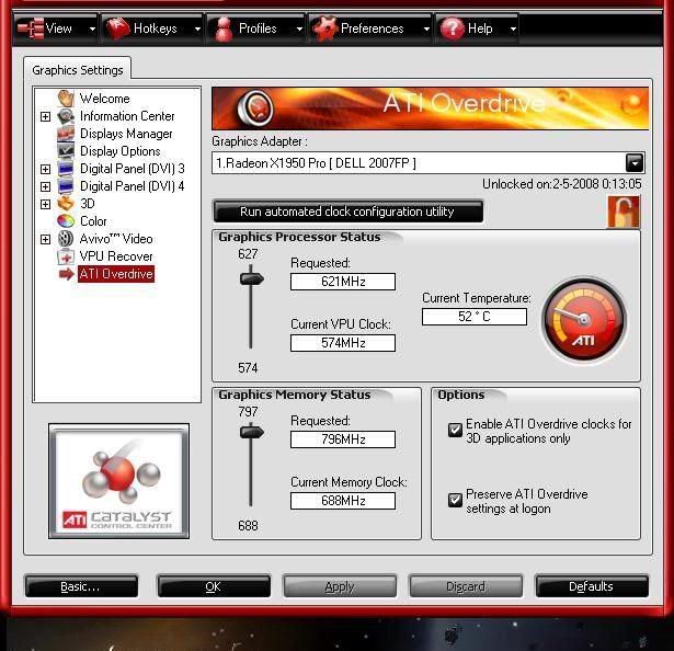 Aangezien het standaard bij mij 669/829 loopt, was ik in het begin erg langzaam met het overklokken. Al snel merkte ik dat het veel makkelijker ging dan ik dacht. De GPU haalt zelfs het maximum van 770Mhz zonder problemen (aangezien CCC een eigen tester heeft is het makkelijk om te zien of de clock stabiel is of niet). Bij het geheugen ging het even hard, al haalde deze het maximum niet. Bij een waarde van 1079Mhz gaf CCC nog geen errors, maar een verhoging van 5Mhz leidde tot een error waardoor ik genoodzaakt was de clocks te verminderen. Een laatste testrun van 770/1079 liep goed door CCC, maar in 3DM06 liep dit vast, waarna ik besloot om een safemarge te houden en de settings te zetten op 750/1049.