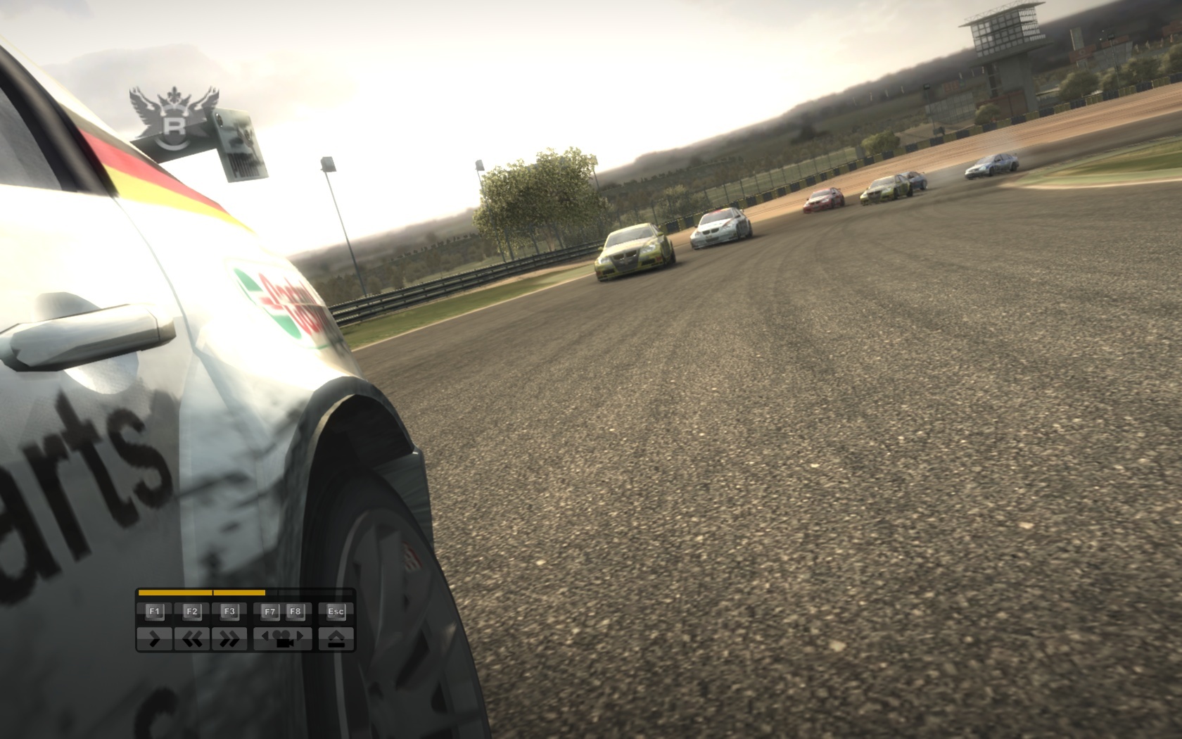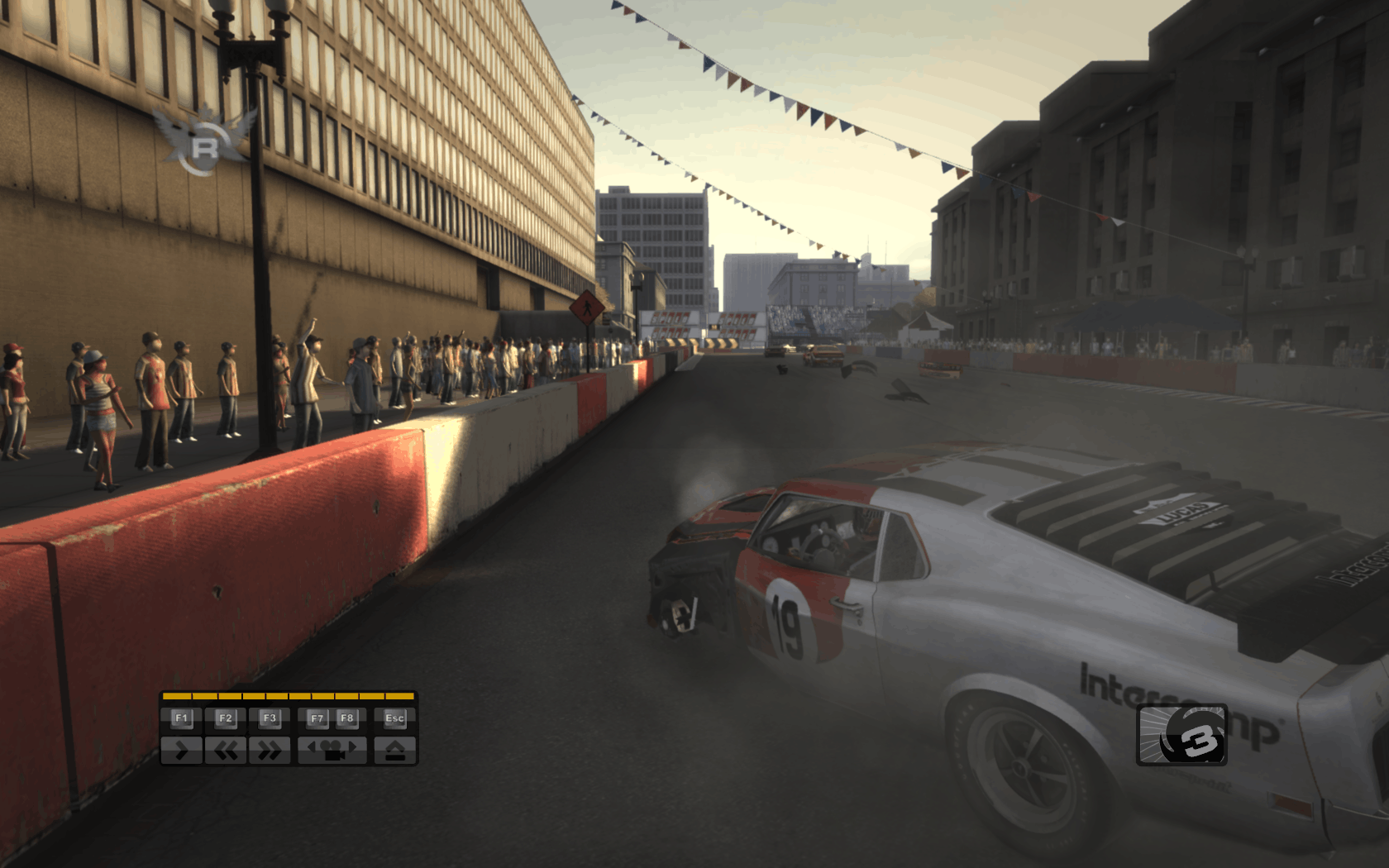Met de F-toetsen bovenaan je toetsenbord kun je de flashback regelen en kan je terugspoelen naar een paar seconden geleden en ram je op F12 en je kan weer verder met racen. |