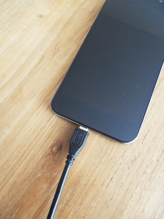 De USB connector zit aan de onderkant, iets links van het midden. Een prima connector echter wel met een vreemde eigenschap. De USB kabel gaat er niet zover in als dat je zou verwachten, deze steekt iets uit waardoor je denkt dat ie los zit. Hij zit er goed in en werkt maar het is een gek gezicht.