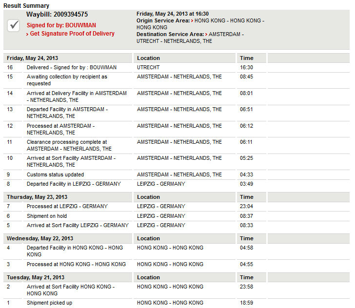 Het pakket werd op 21 mei door DHL als opgehaald bevestigd en lag de 23e reeds in Leipzig, Duitsland. Wegens slecht weer vloog men die ochtend niet, anders had ik 'm donderdagavond al gehad. Het is uiteindelijk vrijdagmiddag geworden wat ik nog steeds een zeer snelle levering vindt vanuit Hong Kong. De gemiddelde kerstkaart heeft er in Nederland meer moeite mee