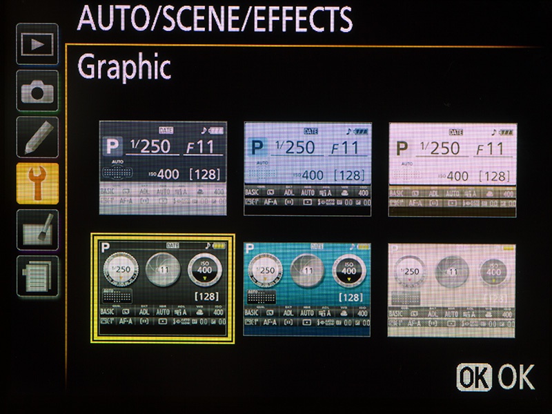 Een handige optie is dat er, als er geen live view wordt gebruikt, verschillende grafische interfaces kunnen worden gekozen voor P/A/S/M enerzijds en de andere standen anderzijds. Dat verkleint de kans op fotograferen met de verkeerde modus aanzienlijk. Gekozen kan worden voor Classic of Graphic display, elk in 3 kleurstellingen (donkergrijs, blauwtinten, champagne). Als er wel live view wordt gebruikt kan er gekozen worden voor verschillende informatie-overlays, bijvoorbeeld voor filmen (inclusief indicator voor geluidsniveau van elk van beide interne microfoons) en een overlay met een raster (vreemd genoeg geen 3x3 maar 4x4 raster, 3x3 zou handiger zijn voor de vele fotografen die willen vasthouden aan de 'rule of thirds').