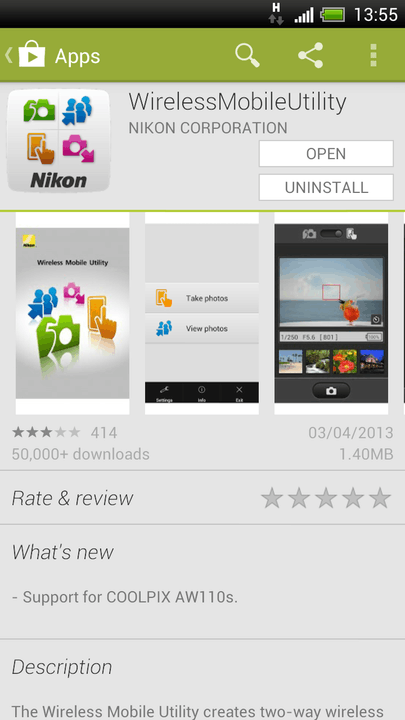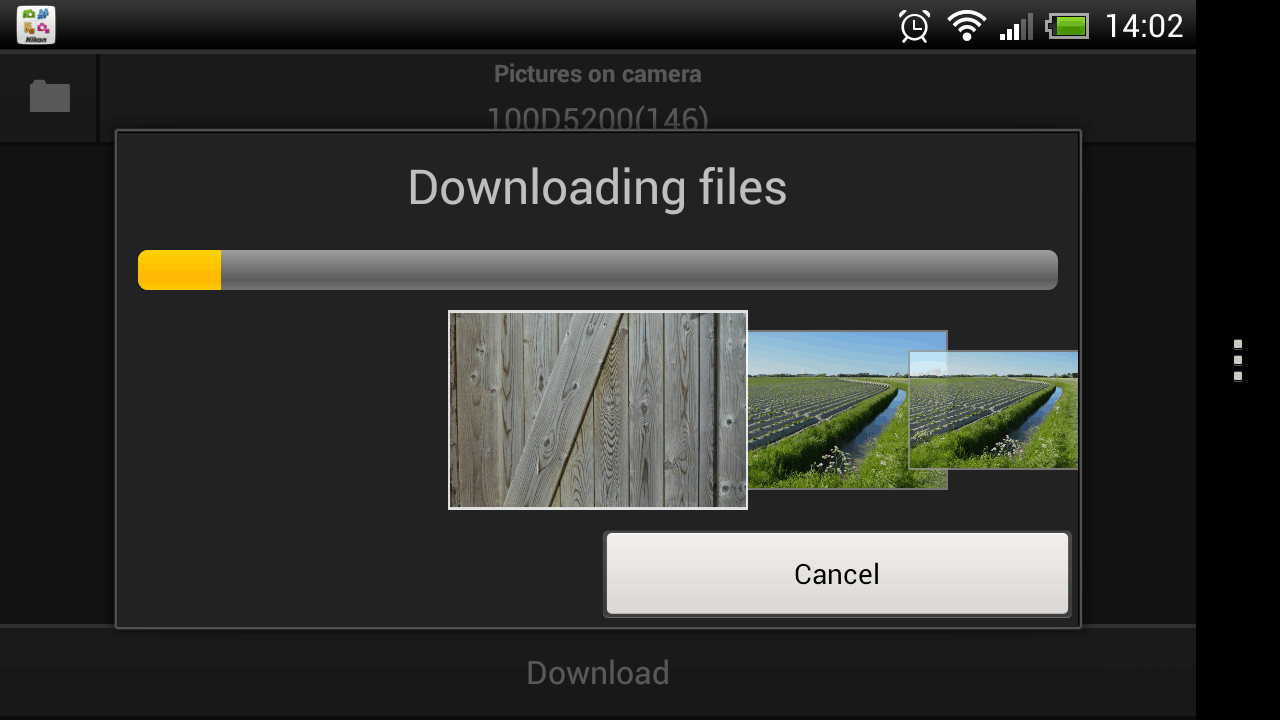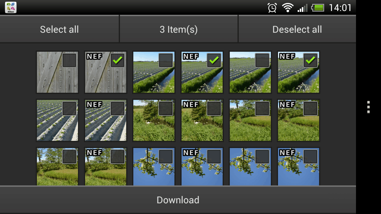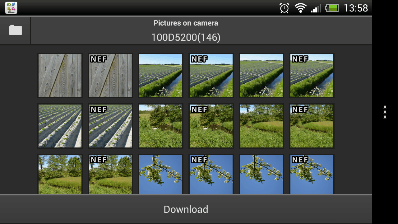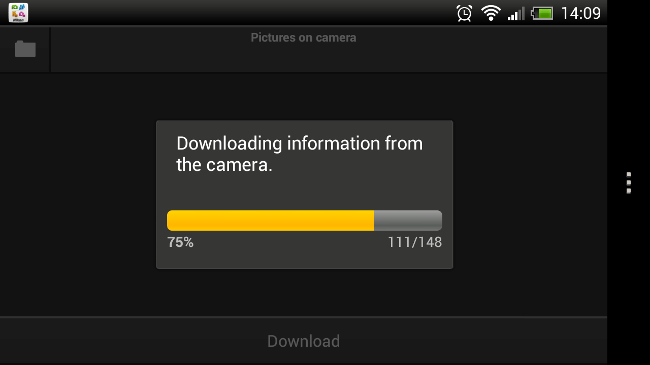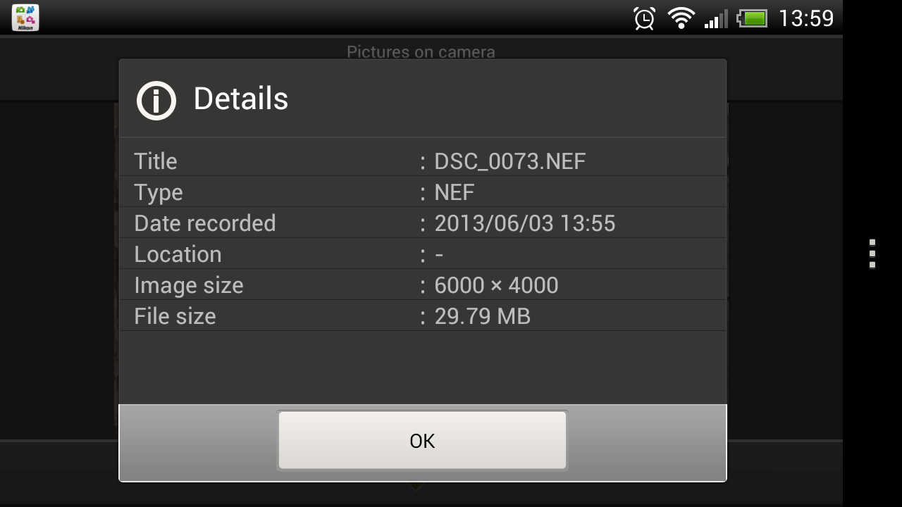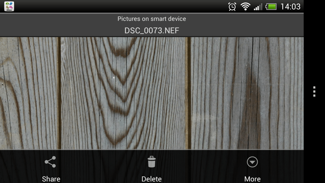 Kies je voor de mogelijkheid om foto's te bekijken, dan downloadt je device eerst "information" van de camera. Vervolgens krijg je een thumbnail-overzicht van de foto's op de camera te zien, waarbij ook wordt aangegeven welke bestanden RAW (NEF) zijn en welke niet. Je kunt nu foto’s selecteren en downloaden naar je device. Als ze op je device staan kun je ze bekijken, er op in- en uitzoomen, ze weggooien of sharen via andere apps. Ook is er een "details"-knop die een pop-up geeft waarin eigenlijk nauwelijks interessante informatie staat (wel bestandsnaam en -formaat, datum en tijd van opname, bestandsgrootte maar geen EXIF-informatie bijvoorbeeld).