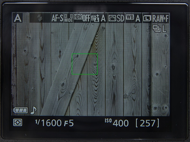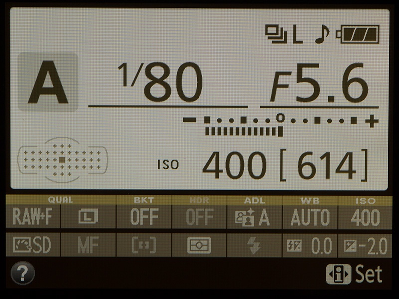 De interface (en dan met name de drie centrale parameters sluitertijd, diafragmaopening en ISO-waarde) lijkt erom te vragen, nee schrééuwen! om met de vingers te worden bediend maar helaas heeft Nikon er niet voor gekozen om het scherm aanraakgevoelig te maken. Met zo'n prachtige, duidelijke interface met grote beeldelementen is dat wat mij betreft echt een gemiste kans.