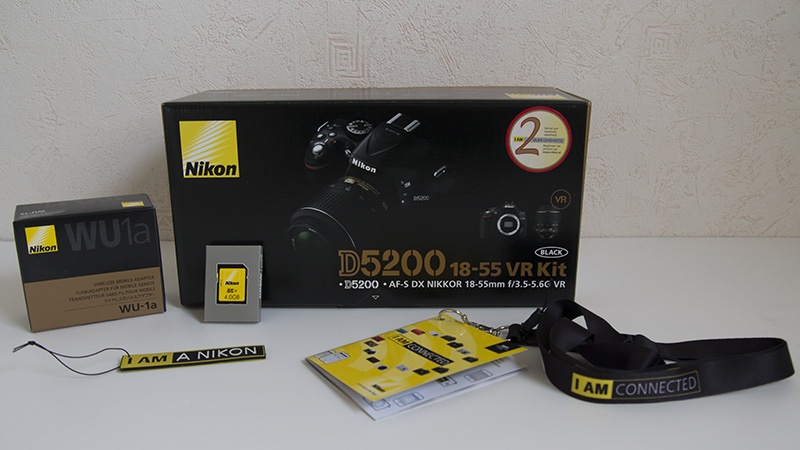 De inhoud van het pakket dat voor de review werd bezorgd. Grote doos: Camera + objectief, acculader, kabels, documentatie en software. Klein doosje: WU-1a, keycord, opbergdoosje. Verder zijn zichtbaar een SD-kaart, sleutelhanger en lanyard met instructieboekje voor de WU-1a.