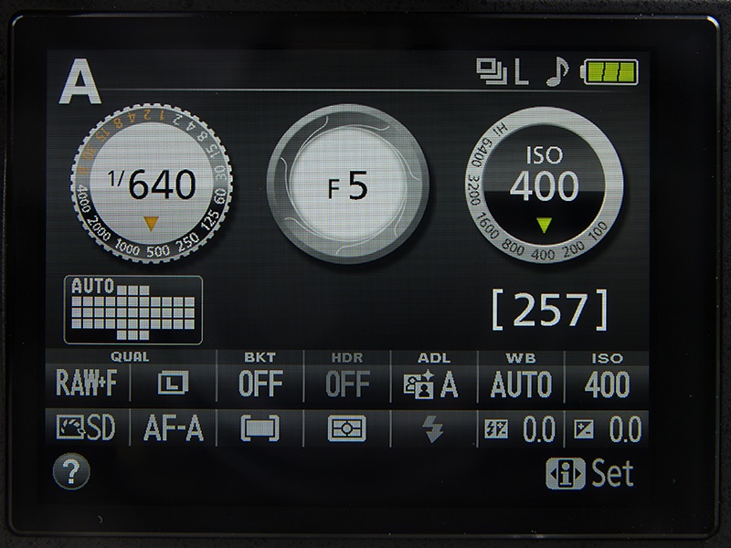 De D5200 is voorzien van een mooi helder scherm, waarvan de helderheid in 7 stappen is aan te passen vanuit het cameramenu. In de volle zon is het al gauw nodig de helderheid van het scherm op de maximale waarde te zetten om te zorgen dat het display goed afleesbaar blijft. Het scherm geeft alle relevante informatie over de instelling van de camera in een duidelijke interface weer. Het bovenste deel van het scherm geeft in grote beeldelementen de belangrijkste instellingen weer: batterijstatus, sluitertijd, diafragma en ISO-waarde, daaronder de gekozen AF-punten, belichtingsschaal en het aantal foto's dat bij de huidige instellingen nog op de geheugenkaart past. Daaronder staan met kleinere symbolen de andere camera-instellingen als fotokwaliteit, autofocusmodus, flitsmodus, flash exposure compensation etc. Al deze waarden zijn met behulp van de <i> knop te selecteren en dan aan te passen zonder het cameramenu in te hoeven duiken maar net zo goed worden er voor sommige instellingen nieuwe schermen geopend om de waarde aan te passen.