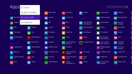 Windows 8.1 heeft een aantal nuttige verbeteringen gekregen die in de praktijk behoorlijk handig zijn op de Surface RT. 1 daarvan is de lijst met apps. Deze is nu te benaderen door een swipe van onder naar boven te doen. De apps kun je rangschikken op 'Date Installed - Most Used - Categorie - Name'. Vooral de 'Date Installed' optie is wel handig, gezien een nieuw geïnstalleerde app niet meer automatisch op het Start Scherm verschijnt.