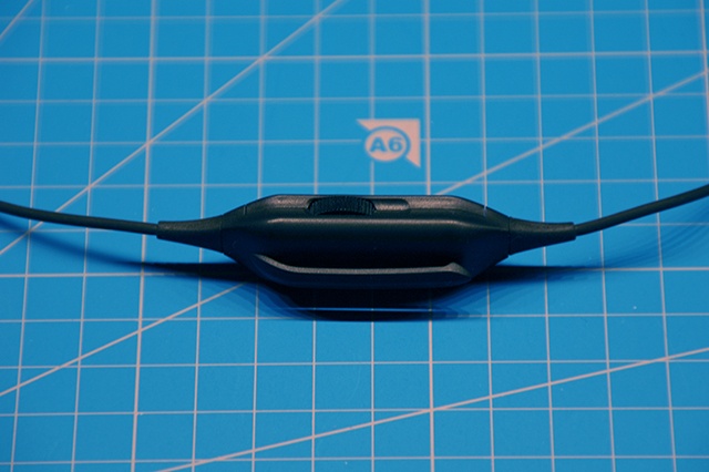 De volume regeling bevindt zich in the dead middle van de kabel. Zo klein als de connector is, zo groot is deze volumeregeling. De regeling is zo groot omdat het een roterende potmeter huisvest. Ik vermoed dat Sennheiser binnen het gestelde budget een zo goed mogelijke regelaar heeft willen implementeren. Roterende potmeters hebben het voordeel ten opzichte van in line (schuivende) potmeters dat ze minder snel kraken. De belastingen die optreden bij het schuiven van een in line potmeter zijn door dat mechanisme moeilijk op te vangen, wat het kwetsbaar maakt. Afgeleid uit de grootte van de behuizing moet het met de lagering van deze roterende potmeter dik in orde zijn. Sennheiser heeft zich, bewust van de grootte van het ding, veel moeite getroost om de overgang van de behuizing naar de kabel vloeiend te laten verlopen. Ze is daar goed in geslaagd. De behuizing heeft een clip om de behuizing aan een kledingstuk te haken. Dit moet dan wel een truitje zijn of zo, de stof van een blouse is net te dun om hem goed op zijn plek te houden. Het gedeelte aan de zijflank van de behuizing waar het volumewieltje van de potmeter uitsteekt is verzonken gemaakt zodat niet per ongeluk iets wat langs je potmeter schuift het volume knalhard kan draaien. Keerzijde hiervan is dat van het wijzigen van het volume een wat bewuste actie is gemaakt. Het wieltje voelt te onduidelijk aan. Al met al is het ding groot en bulky, en zit snel in de weg. Wat mij betreft had de regelaar geheel achterwege kunnen blijven. Het vrijkomende geld had in extra degelijkheid van de bekabeling geïnvesteerd kunnen worden. Dat de volumeregelaar in het midden van de kabel is geplaatst is verstandig, omdat ze dan, wanneer je zit, in je schoot rust en je het gewicht niet voelt.