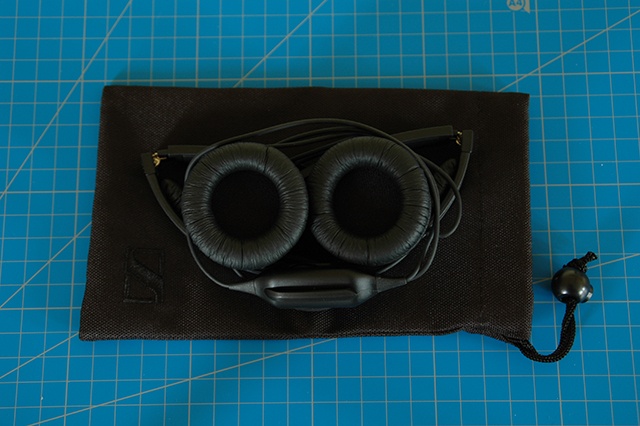 Bij het uitvouwen de omgekeerde volgorde gebruiken, eerst de poot zonder bekabelde oorschelp, en de poot met bedraadde schelp als tweede. En zorg dat de kabel uit de buurt is van de uitvouwende om ongewilde knipacties uit te sluiten. In opgevouwen toestand is de koptelefoon eenvoudig in de bijgevoegde draagbuidel te schuiven die met een trekkoord is dicht te trekken. Met wat handigheid is de koptelefoon in 15 – 20 seconden op te vouwen en op te bergen.