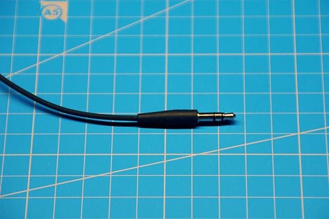 De connector, een 3.5mm Jack plug, is compact vormgegeven en voert de draad rechtstandig uit, dus niet onder een hoek van 90 graden, zoals vaak het geval is. Voor mannenvingers is de plug wat klein en de overgang van de plug naar de kabel heeft geen geribbelde trekontlasting, zoals je vaak bij kabels ziet. Deze trekontlasting verdeelt de buigspanning over een groter gebied van de kabel . Zo kan het risico op knik en kabelbreuk worden verkleind. Dat de plug de kabel rechtstandig uitvoert maakt het trouwens ook een voordeel dat de plug niet te groot is.