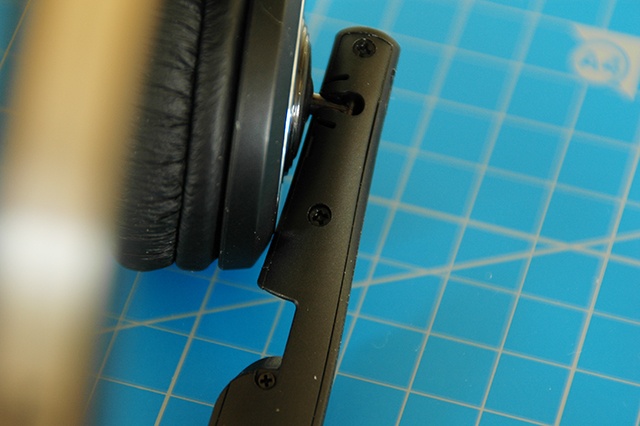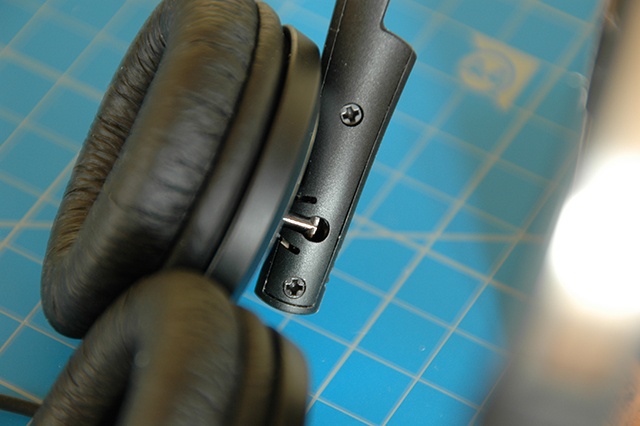 De scharnierpunten van de beugel zijn van staal en ook de vormdelen die de beugel samenstellen hebben een stalen strip als kern. De scharnierende vormstukken waarop de oorschelpen zijn gemonteerd hebben eveneens een stalen kern. De vatting in de beugeluiteinden waarin de oorschelpen zelf scharnieren is van kunststof, maar het kunststof sluitstuk voor dit scharnierpunt is ruim gedimensioneerd en is met stalen schroefjes vastgetrokken. Het oorschelpscharnier, zelf van metaal, is zo goed opgesloten. Als we ons realiseren dat door dit scharnier ook de signaaldoorgifte naar de oorschelp moet worden geregeld, is te beseffen dat de beugeluiteinden drukke hoekjes zijn in het koptelefoon ontwerp.