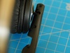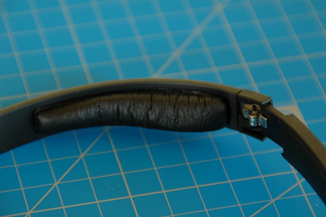 Op zich is dit in elkaar vouwen een trucje wat je de eerste keer bewust moet doen. Ik betrapte mijzelf bij de eerste keer in elkaar vouwen op de gedachte “verrek, hoe ging dat uitvouwen nu net?”. Met enig beleid kreeg ik de slag te pakken. De eerste poot van de beugel die ik opvouw is die met de bekabelde oorschelp. Die vouw ik zover door tot die poot de polstering aan de binnenzijde van de beugel raakt. De kabel gaat hierbij onder de andere poot door om te voorkomen dat ze ingeklemd raakt tussen de poten. Dan is de tweede poot eenvoudig op te vouwen en achter de eerste poot te haken. Om dat haken toe te lichten: beide poten van de beugel hebben een uitsparing voor de andere poot. Vouwen de poten op een correcte manier op dan vallen de uitsparingen in elkaar. De uitsparingen hebben in de bewegingsrichting van het in en uitklappen van de poten afgeronde flanken om het in elkaar schuiven van de poten te bespoedigen.