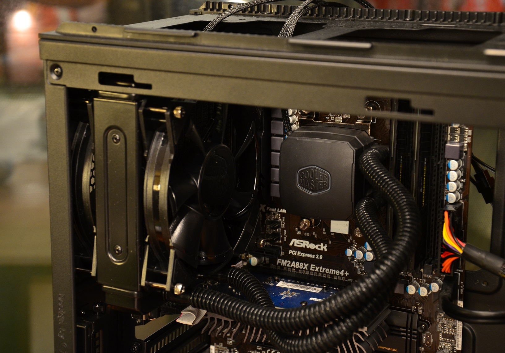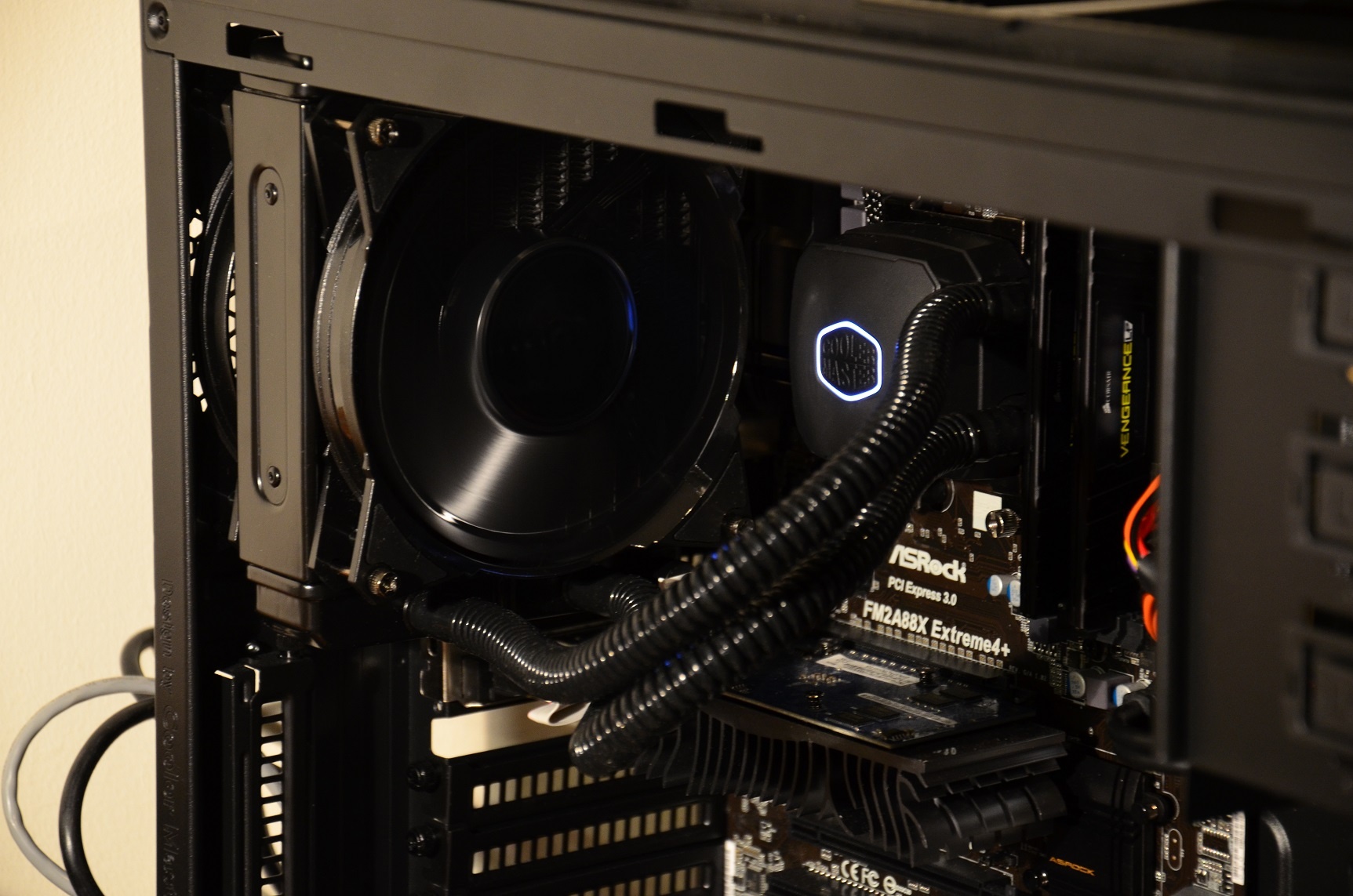 Eerst wat voorbereidend werk. Dat ik de ventilatoren in een push-pull configuratie alvast op de radiator had geplaatst was al zichtbaar, en dat kan elke flapdrol natuurlijk eenvoudig doen. Nu zullen lezers die al vaker een 2-fan waterkoeler hebben geplaatst zich wellicht afvragen hoe dat zo gaat met het ophangen als de achterste ventilator er al op zit, gezien je voor veel koelers de 2e ventilator niet vooraf kan monteren. Maak je geen zorgen, daar kom ik zo op terug.