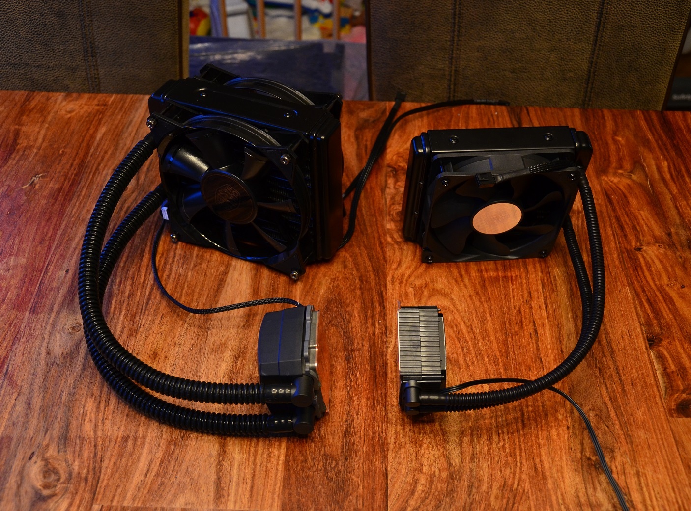 Nu zal je misschien nog altijd denken, wat is er nu zo “XL” aan deze koeler. Ik had dat idee ook voor ik aan de Nepton begon, want foto’s zetten niet altijd dingen goed in perspectief. Om het beter te laten zien heb ik de CM Seidon 120V er even naast gezet. Zo zie je dat het echt een flink verschil is. De radiator is flink dikker en groter, de ventilatoren zijn groter (en zien er ook aggressiever uit), de slangen zijn een flink stuk dikker, en ook de pomp/koelblok is een maat groter. Ik vind de pomp er ook een stuk luxer uit zien overigens, al geldt dat eigenlijk voor het hele product. De Nepton 140XL is wel duurder natuurlijk, dus is het ook niet gek dat je daar wat voor terug krijgt.