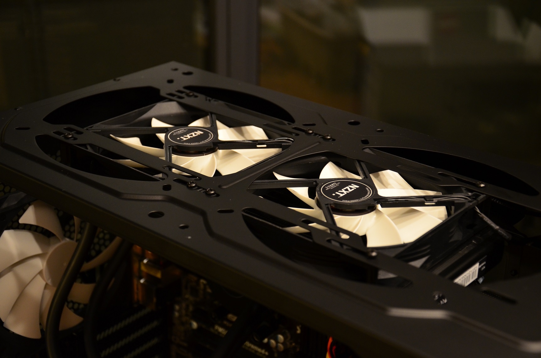 Een klein stukje voor dames en heren die niet weten wat dat is: De ventilatoren zorgen voor luchtstroom wat het water in de radiator koelt. Je kan ventilatoren aan de binnenkant van de radiator plaatsen dat ze lucht door de radiator de case uit drukken (push), of juist andersom, aan de buitenkant, zo dat ze lucht door de radiator naar buiten trekken (pull). In deze ventilatoren komt de lucht er aan de kant van het NZXT logo uit, oftewel op de eerstvolgende foto zie je dat de ventilatoren de warme lucht de case uit ‘trekken’. Een push-pull setup, waar ik straks nog even op terug kom, houdt weer in dat je ventilatoren aan beide kanten van de radiator plaatst, om een nog sterkere luchtstroom te krijgen.