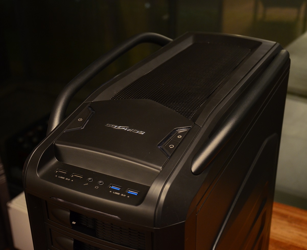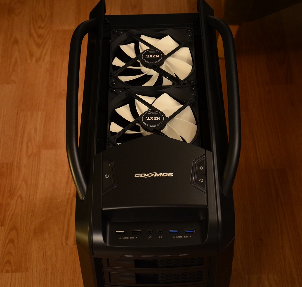 En dan waar het toch grotendeels om draait bij een Cosmos, het frontpanel / de voor-/boven-kant (volg je nog?). De panelen en onderdelen zijn kunststof, en ondanks dat je dat merkt voelt het wel gewoon erg stevig aan. De looks zijn echter eenvoudig verhaal, die zijn echt top. Smaak blijft persoonlijk, maar het geheel ziet er keurig uit. Een mooi logo, grote knoppen (inclusief knop om de LEDs van de ventilatoren uit te schakelen), en een strak afgewerkt frontpanel. Eigenlijk het enige wat ik te klagen vind is dat de klepjes voor de 5.25” wel wat goedkoop aanvoelen ondanks dat je dat er niet aan af ziet, gelukkig zit je daar natuurlijk zelden aan. Maar het is vooral allemaal erg stoer om te zien.