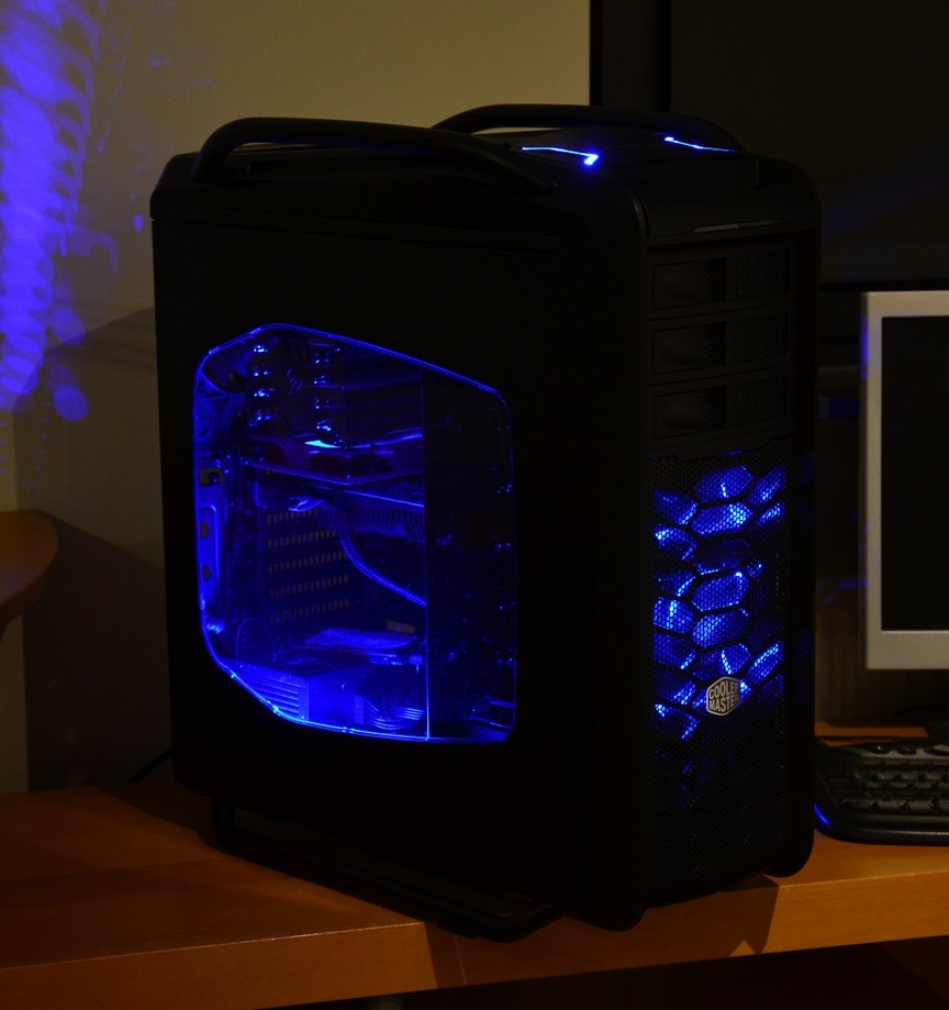 Een wat ongebruikelijke heading voor mijn case-reviews, maar ik denk dat de Cosmos er wel eentje mag hebben. Een belangrijk deel van de uitstraling komt uiteindelijk van de verlichting. Met 2 blauwe LEDs om de frontpanel knoppen, en 2 blauwe LED ventilatoren richt Cooler Master deze case uiteraard op mensen die een beetje verlichting wel kunnen waarderen. Net als de afwerking van de andere elementen is de verlichting uitstekend uitgevoerd. Verlichting een beetje redelijk op de foto zetten valt niet mee, maar ik ben zeker niet ontevreden met het resultaat. Voor de duidelijkheid, deze fotos zijn natuurlijk van een test setupje, vandaar dat het intern nog een rommeltje is. Eerst testen en experimenteren, daarna pas afwerken.