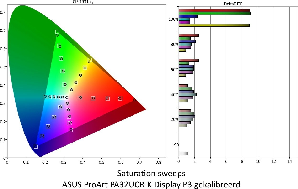 Een kalibratie doet niks voor de ietwat lage kleurdekking, maar verhelpt wel de te hoge gammawaarde. De grijsweergave is nu erg netjes, in lijn met de concurrentie van Dell en Eizo. Ook in de colorcheckertest behaalt de PA32UCR-K nu het zilver, na de monitor van Dell die een volledige P3-dekking biedt, en heel verzadigde kleuren daarmee beter kan weergeven.