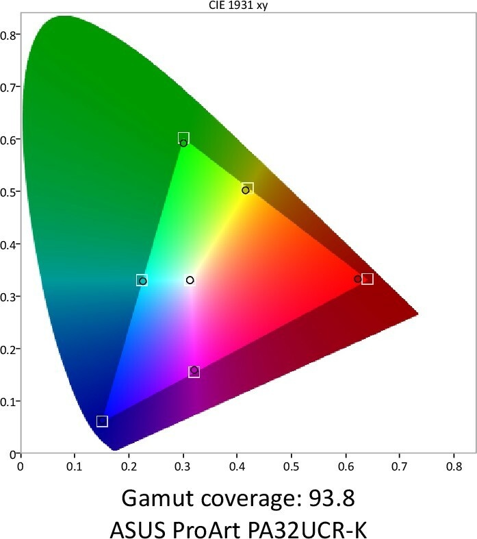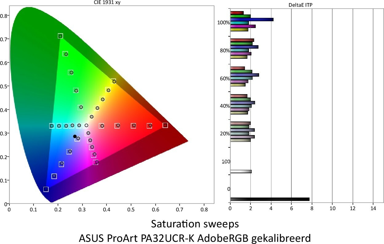 De PA32UCR-K dekt AdobeRGB voor 99 procent af en dat is uitstekend. De ingebouwde stand in het menu voor deze kleurruimte blijkt bovendien erg goed afgesteld. De ASUS-monitor is een van de best afgestelde schermen, in lijn met de concurrent van Eizo en stukken beter dan de Dell UP2720Q vóór kalibratie. Bij de PA32UCR-K heeft een kalibratie niet veel nut. In zowel de kleur-, grijs- als colorcheckertests noteren we na kalibratie iets hogere gemiddelde afwijkingen dan out-of-the-box.