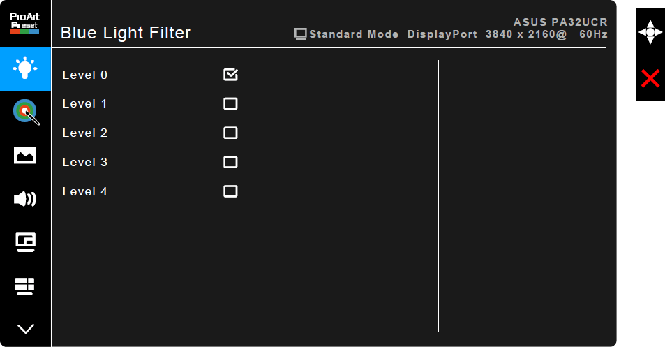 De osd van de PA32UCR-K bevat ongeveer dezelfde functionaliteit als op de eerder aangehaalde ProArt-schermen. Er zijn maar liefst dertien kleurpresets beschikbaar, met opvallend genoeg ook een Rec.2020-modus. De meeste schermen hebben niet zo'n stand omdat ze toch niet in de buurt komen van dat zeer brede kleurbereik, maar de PA32UCR-K wel, zoals verderop in het artikel blijkt. Net als de eerder geteste beeldbewerkingsschermen heeft de PA32UCR-K een optie voor uniformiteitscompensatie, wat bij dit scherm niet samengaat met local dimming en hdr. Local dimming kan eventueel ook in sdr gebruikt worden; het menu geeft opties voor de reactiesnelheid van het backlight, maar geen controle over het compromis tussen een hoger contrast en meer zichtbare overgangen tussen heldere en donkere zones.