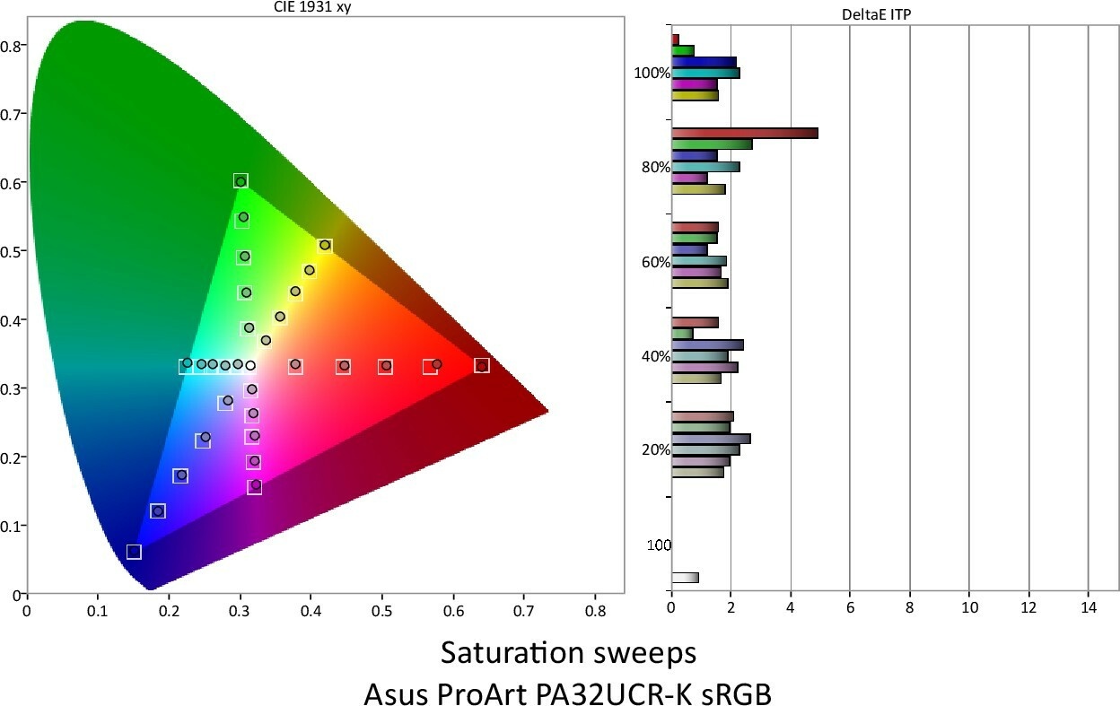 De kleurnauwkeurigheid in hdr is bij de PA32UCR-K een stuk beter dan bij de PA32UCX-PK. Het helderheidsverloop is goed, met een klein beetje roll-off rondom het knikpunt waar het scherm niet meer feller kan. Eventueel kun je dat nog uitschakelen via de opties in het osd, waarbij het scherm de helderheid simpelweg afkapt als hij tegen zijn maximum aanloopt. Veel kleuren worden met een wat te hoge verzadiging weergegeven. Dat zou eventueel nog kunnen worden verbeterd met een kalibratie.