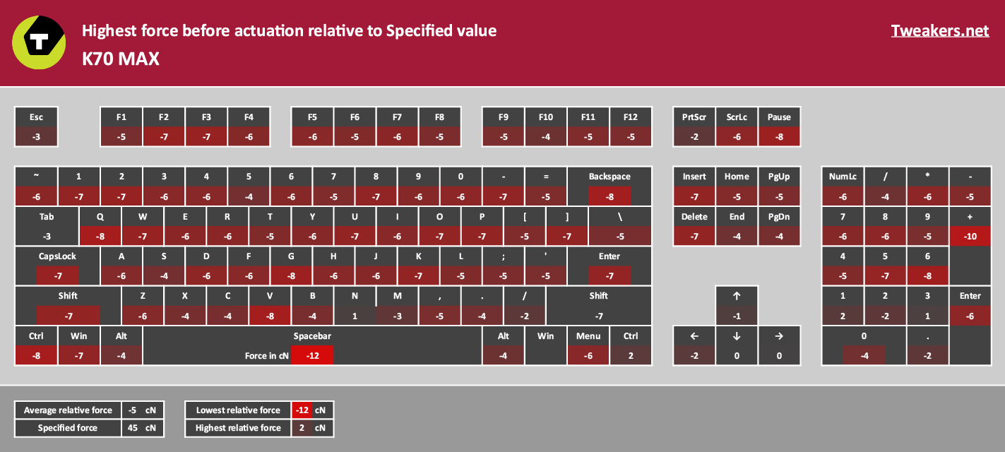 De resultaten geven we weer in plattegronden van het toetsenbord met de krachten en actuatiepunten per toets. Op die keyboardmaps kun je van elke toets bekijken wat de karakteristieken zijn wat travel en uitgeoefende kracht betreft. Wil je de K70 makkelijker met zijn concurrenten vergelijken, dan kun je terecht bij de grafieken, waarin we de gemiddelde prestaties van alle toetsen vergelijken.