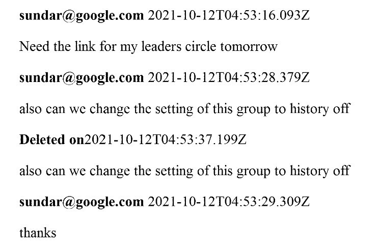 In de zaak kwamen ook gesprekken binnen Google naar voren, waarin Googles platform- en ecosysteemhoofd Margaret Lam haar personeel herhaaldelijk vroeg om hun chatgeschiedenis uit te zetten. Dat schrijft The Verge. Als Google-medewerkers dat doen, worden chatberichten na 24 uur verwijderd van Googles servers. Anders gebeurt dat na 30 dagen in een-op-eengesprekken of na 18 maanden voor threads in groepsgesprekken. Lam vroeg een collega bijvoorbeeld: "Is het te veel gevraagd om geschiedenis uit te zetten? Veel gevoeligheid met legal tegenwoordig :)" Toen een werknemer vertelde dat hij een legal hold had voor een rechtszaak, en dus zijn communicatie en documenten moest bewaren, zei ze: "Oké, misschien haal ik je uit het gesprek :)"