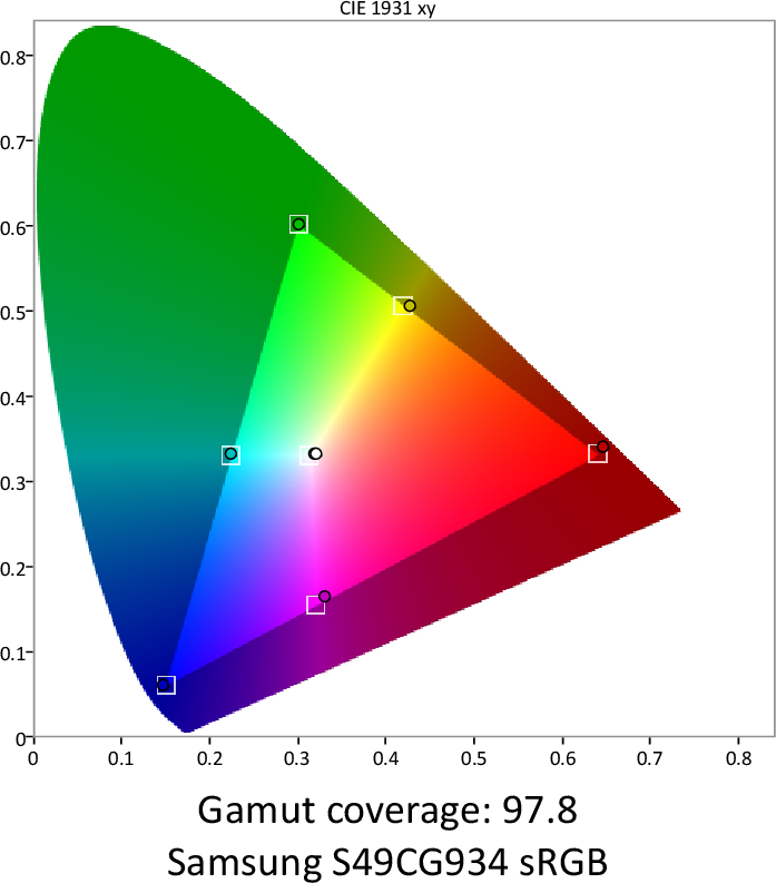 Standaard tonen zowel de ASUS ROG Swift OLED PG49WCD als de Samsung Odyssey G9 OLED G93SC het volledige, zeer brede kleurbereik van het paneel. Dat komt niet goed overeen met een bepaalde standaard. Voor 'normale' sdr-content kun je beter overschakelen op de sRGB-modus, waarover beide monitors beschikken. ASUS heeft ook een functie om het bereik te beperken tot DCI-P3, maar Samsung niet, wat in de metingen voor die kleurruimte gevolgen gaat hebben.