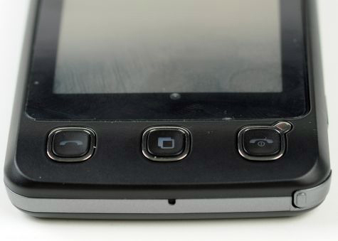 De voorkant is uiteraard voor het overgrote deel voor het scherm gereserveerd. Daarboven zitten een klein speakertje en het logo van LG. Onder het scherm bevinden zich knoppen: eentje voor opnemen, eentje voor ophangen en, daartussen, een knop voor multitasken. Die middelste knop brengt de gebruiker tevens naar een verzameling instelbare favoriete snelkoppelingen. Daarmee heeft LG een opvallende ontwerpkeuze gemaakt: bij veel telefoons is de middenknop een 'ok-knop', maar LG heeft ervoor gekozen de functie van de middelste toets te veranderen. Boven het rechterknopje zit nog een kleine led-indicator.