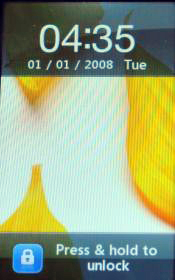 Het is overigens duidelijk waar de LG-ontwerpers zich door hebben laten inspireren. Wie bijvoorbeeld het toestel van de toetsblokkering wil halen heeft twee keuzes: naast de hardwareknop op de zijkant, kun je ook via het scherm het toestel deblokkeren. Je krijgt dan eerst een screensaver te zien, met aan de bovenkant een halftransparant venster met tijd, datum en eventuele meldingen, zoals gemiste gesprekken. Aan de onderkant van het scherm zit de optie om te deblokkeren door op het scherm te tikken en het even vast te houden. Dat laatste aspect is eigenlijk het enige grote verschil hierin met de grote inspiratiebron, de interface van de iPhone.