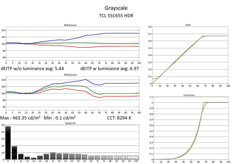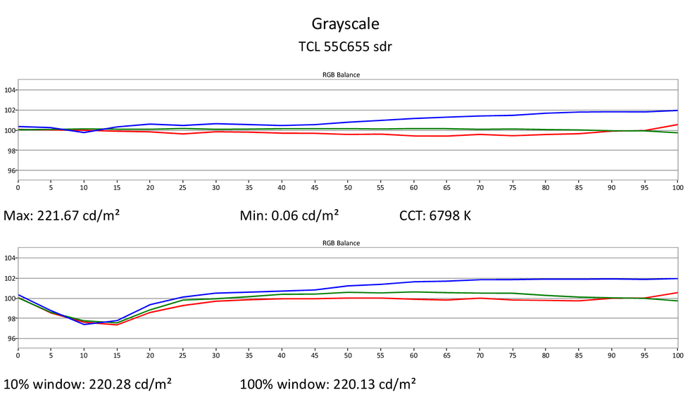 Ook onze sdr- en hdr-metingen hebben we bij deze TCL-tv's gedaan in de Filmmodus. Alle grijs- en kleurafwijkingen blijven bij de C65 netjes onder de zichtbare grens van 3 ΔE2000. De C65 Pro is iets minder nauwkeurig: de gedetailleerde-kleurafwijking blijft nog wel onder die zichtbare grens, maar de gemiddelde kleur- en grijsafwijking net niet. De afwijkingen zijn echter klein genoeg om ook bij de C65 Pro van een voldoende nauwkeurige sdr-weergave te genieten, terwijl de C65 het simpelweg goed doet.