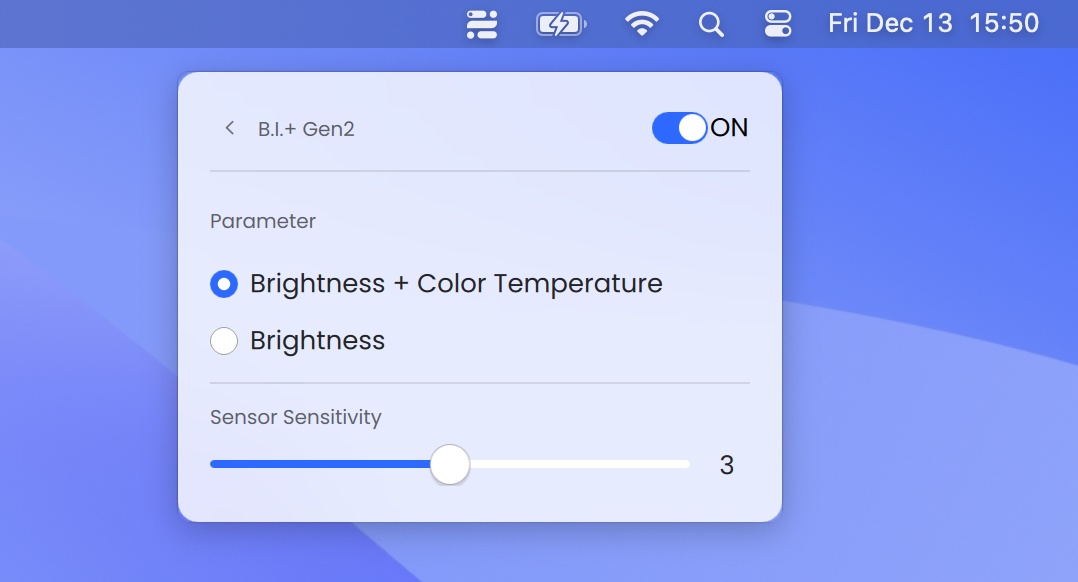 Display Pilot 2 nestelt zich onder macOS als een knop in het bedieningspaneel aan de rechterkant van de menubalk. Vanaf daar geeft een snelmenu toegang tot de meeste schermfuncties, waaronder de beeldmodus en kleurweergave. De helderheid kun je regelen via dezelfde toetsen als bij het ingebouwde scherm of via de automatische helderheidsregeling. De MA320U heeft een lichtsensor die zowel helderheid als kleurtemperatuur van het omgevingslicht meet, net zoals de sensor van het ingebouwde display van een MacBook. Het is met Display Pilot verder mogelijk om een combinatie van beeldinstellingen te synchroniseren met een Focus-modus die je in macOS instelt. Een andere extra functie die weinig met het scherm zelf te maken heeft, is de mogelijkheid om vensters in verschillende lay-outs te rangschikken.