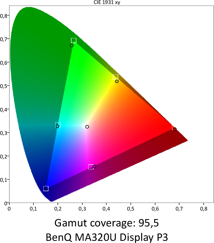 De bovenstaande metingen zijn uitgevoerd met onze gebruikelijke testopstelling, waarbij een Windows-pc het beeld uitstuurt. De BenQ MA320U is natuurlijk bedoeld voor gebruik met een Mac. We hebben dus een tweede set metingen uitgevoerd met de MA320U aangesloten op een iMac, waarbij het scherm in de door BenQ voor Mac-gebruik bedoelde M-Book-beeldmodus staat. Met behulp van het bijbehorende icc-profiel in de Display Pilot 2-software neemt macOS de kleurconversie voor sRGB en Display P3 voor zijn rekening.