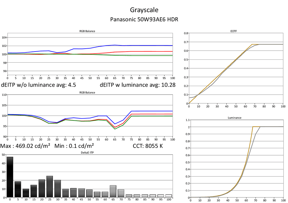 De afbeelding hierboven laat dit zien. De bovenste grafiek toont de verhouding tussen rood, groen en blauw. In dit geval zien we dat rood nipt oververtegenwoordigd is en daardoor ontstaat een iets te rode of warme zweem voor grijstinten. De tweede grafiek toont dezelfde data, maar combineert de kleurweergave met de helderheid. Hier zie je dat de tv donkere grijstinten nét iets te donker weergeeft, terwijl vooral de middentonen relatief juist wat te helder zijn.