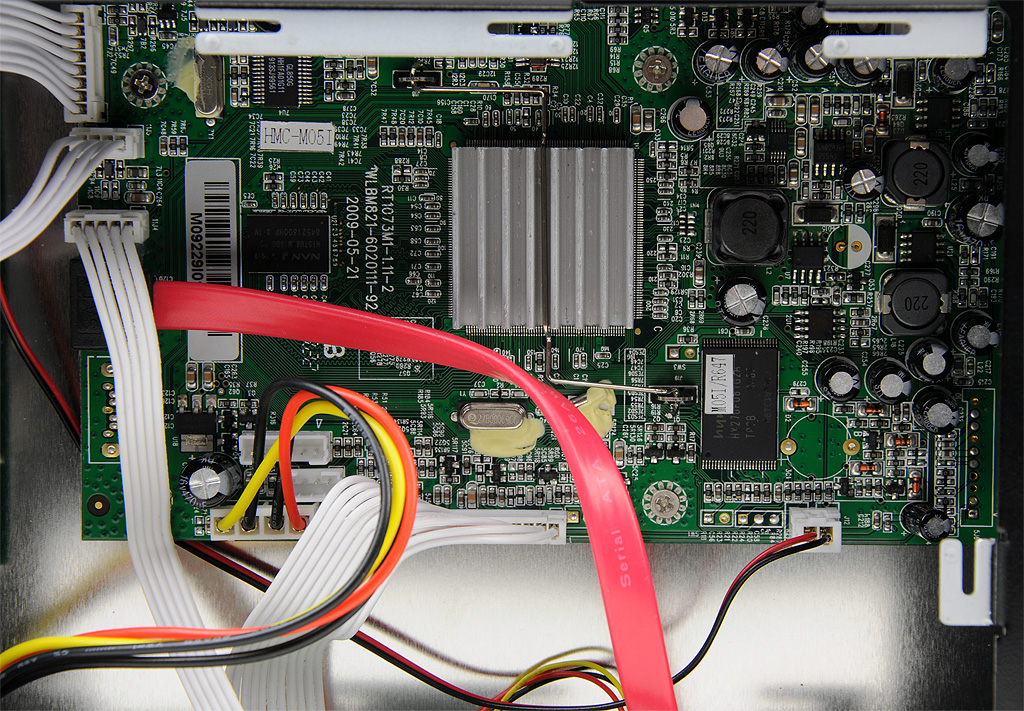 Naast de usb-poorten heeft AC Ryan aan de rechterzijkant een geheugenkaartlezer, zodat bijvoorbeeld foto's die op een sd-kaartje staan opgeslagen snel te bekijken zijn. Aan de onderzijde van de behuizing vinden we een klepje. Na het verwijderen van twee schroefjes krijgen we toegang tot het binnenwerk. Op het klepje dient een 3,5"-harddisk vastgezet te worden, hoewel een 2,5"-schijfje met sata-interface ook zal werken. Bij het openen van het kastje kunnen we een blik werpen op de pcb en de Realtek-processor met daarop een heatsink. Het moederbord, eveneens uit de fabriek van Realtek, ziet er goed afgewerkt uit en blijkt volgens de opdruk in mei 2009 te zijn geproduceerd.