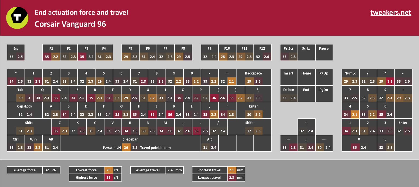 Het actuatiepunt van de Plasma-switches wijkt aardig af: volgens de specificaties zou dat op 2mm moeten liggen, maar gemiddeld meten we 2,3mm met uitschieters naar 2,6mm. Ook de laagste gemeten actuatieafstand is nog altijd meer dan de gespecificeerde, terwijl de zogenaamde 'bottom out'-afstand, de totale travel of maximale diepte dus, op 3,9mm gemiddeld komt. Voor snelle acties als gaming is een grotere actuatieafstand meestal onwenselijk: snelle en precieze bewegingen kunnen wat langer duren. Voor tikken vind ik een diepere actuatie juist altijd fijn, omdat het (bij mij) minder foutieve aanslagen oplevert.