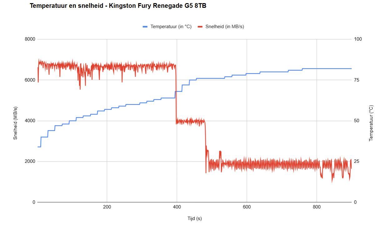 We zien bij het temperatuurverloop throttling mooi in twee stappen ingrijpen. De snelheid wordt eerst verlaagd tot ongeveer 4GB/s, maar als de temperatuur dan nog steeds oploopt, gaat de snelheid verder omlaag tot 2GB/s.