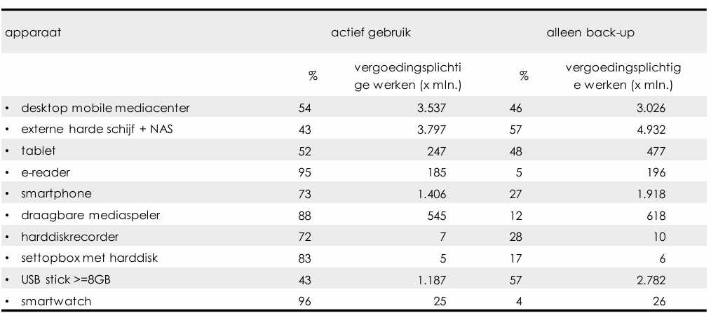inmiddels in onbruik geraakt. Dat het kopiëren op de apparaten waarvoor een vergoeding geldt afneemt, blijkt niet uit onderzoeken. Vooralsnog blijkt dat er wel degelijk op grote schaal gekopieerd wordt, aangezien we nu met screenshots en clips veel meer nieuwe toepassingen zien. Er wordt dus nog altijd op grote schaal vergoedingplichtig werk gekopieerd en daarvoor is de thuiskopieregeling nou juist bedoeld. Vroeger ging het om cassettebandjes en cd-schijven. Die zijn nu niet meer relevant en hebben plaatsgemaakt voor tablets, smartphones en wearables. Er komen ook steeds nieuwe vergoedingsplichtige vormen van kopiëren bij, zoals het opslaan van bestanden in de cloud. Het is dus een verschuiving van de technologie, maar het kopieergedrag is niet wezenlijk anders. Het is zeer consistent met het verleden."