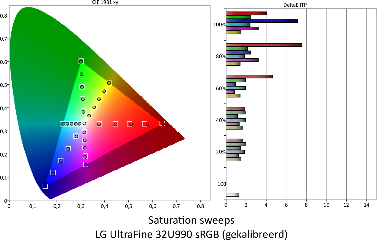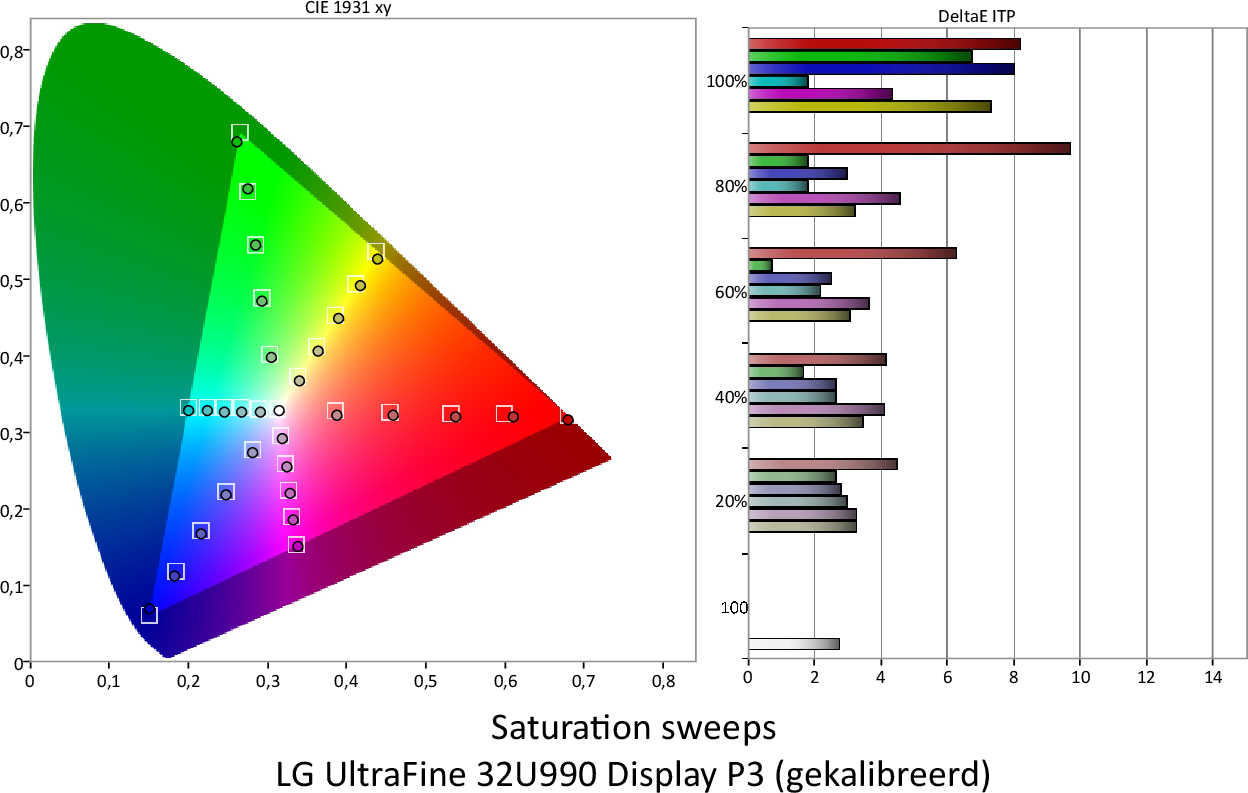 Hoewel de 32U990A over drie 'Studio'-profielen beschikt, die blijkens de productpagina de beste weergave zouden moeten bieden in combinatie met een Mac, gebruikt het scherm met die settings zijn volledige kleurbereik, waarbij groentinten meer naar Adobe RGB-groen neigen. Datzelfde geldt voor de overige beeldmodi, waarvan we de standaard Custom-modus hebben gebruikt om het scherm voor Display P3 door te meten. Dat levert logischerwijs een erg hoge kleurafwijking op, en de gemiddelde ColorChecker‑afwijking komt ook uit op meer dan 9 ΔE ITP, omdat mengkleuren en minder verzadigde kleuren ook mee worden uitgerekt naar het grotere kleurbereik van het scherm.