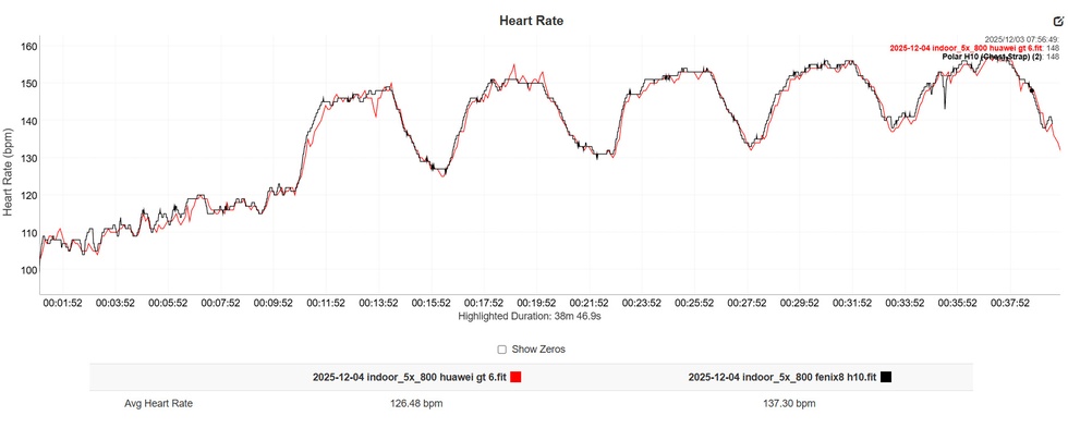 Onderstaande grafieken laten de optische hartslagmeter van de Huawei Watch GT 6 (rood) zien ten opzichte van de Garmin fēnix 8 met Polar H10-ecg-borstband (zwart). Die laatste kan gezien worden als een betrouwbare referentiemeter.